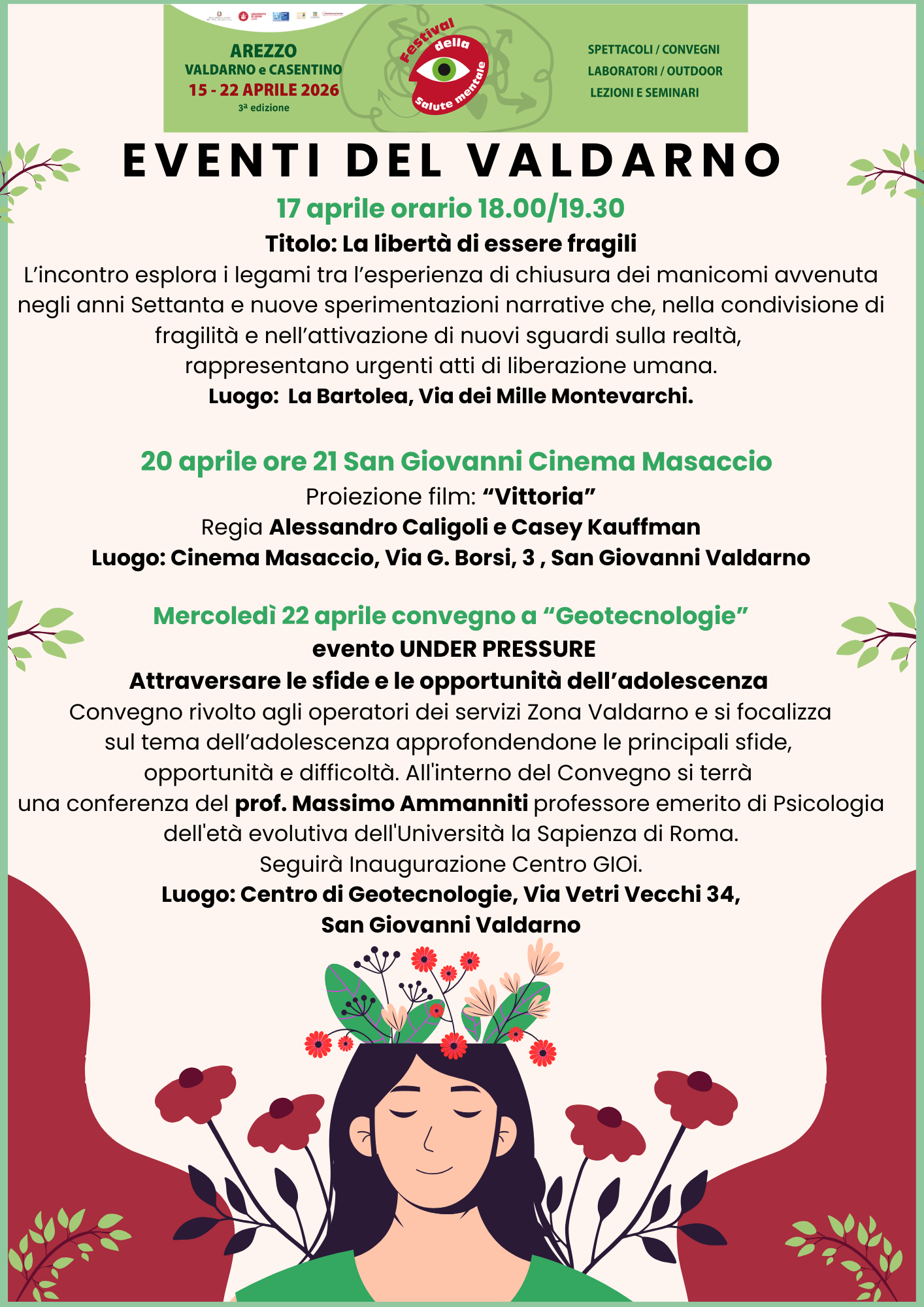 Anche il Valdarno sarà protagonista della terza edizione del Festival della Salute Mentale, in programma dal 15 al 22 aprile 2026, con un calendario di appuntamenti pensati per sensibilizzare la comunità sui temi del benessere psicologico, dell’inclusione e delle sfide legate all’adolescenza.